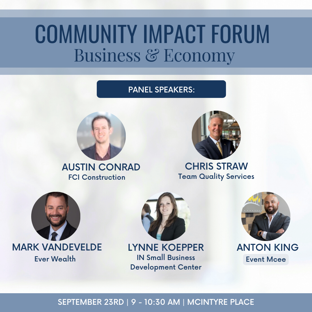 Speakers includes Austin Conrad of FCI Construction, Chris Straw of Team Quality Services, Mark Vandevelde of Ever Wealth, Lynne Koepper of the IN Small Business Development Center, and Anton King as the event mcee.